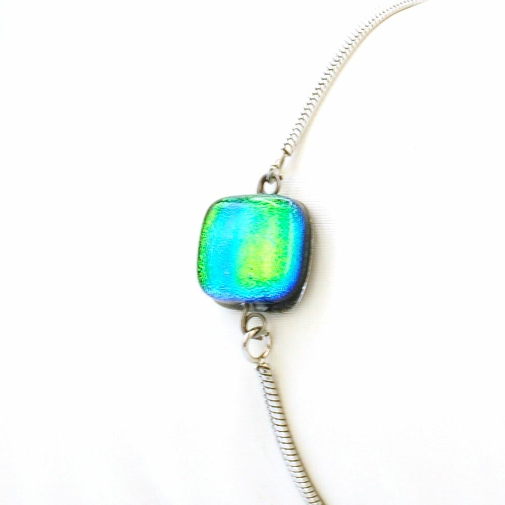 Eine handgefertigte, irisierende Glasperle in Kombination mit dichroitischem Glas, die schimmernde und wechselnde Lichtreflexe erzeugt. Gefasst an einer hypoallergenen Edelstahlkette und -elementen – ein langlebiges Material, das weder Wasser noch Zeit fürchtet.