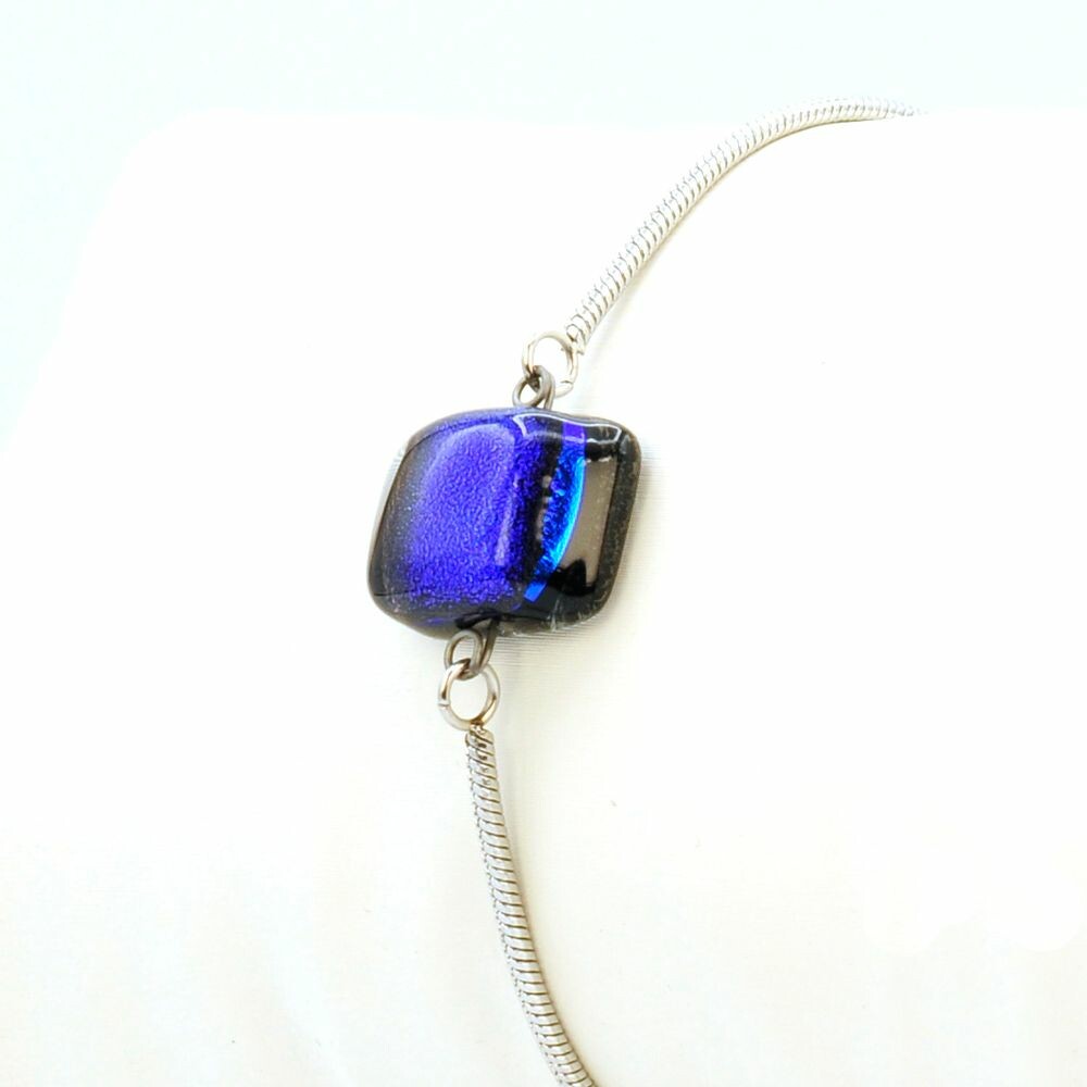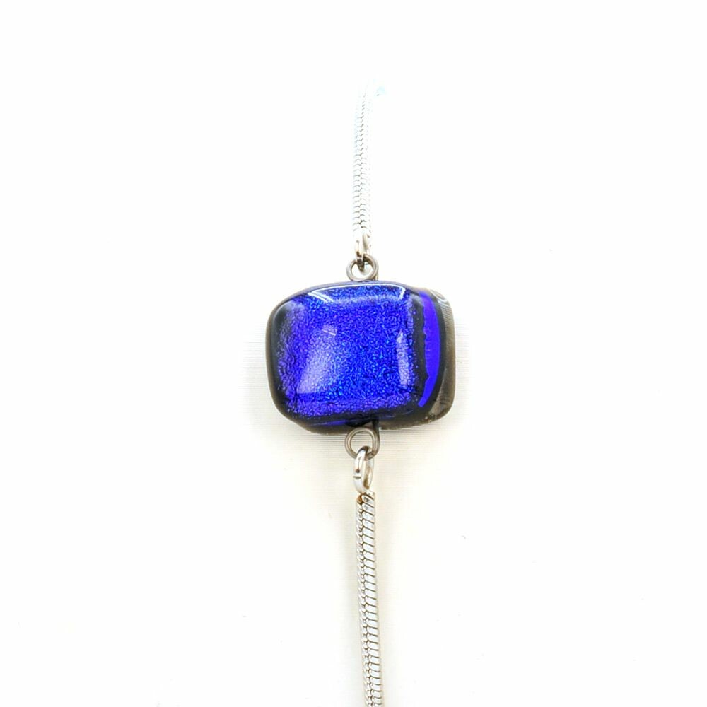 Perle en verre artisanal irisé associée à du verre dichroïque, révélant des reflets changeants et lumineux. Montée sur une chaîne et des apprêts en acier inoxydable hypoallergénique, un matériau durable qui ne craint ni l’eau ni le temps.