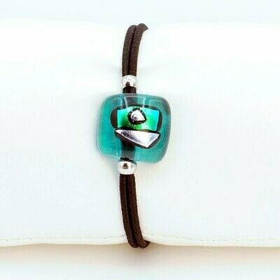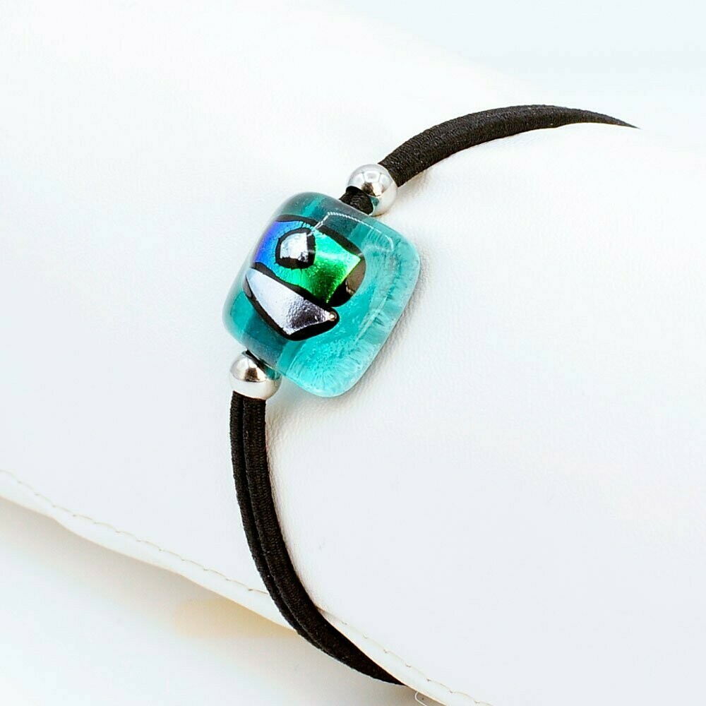 Une perle en verre artisanal turquoise rehaussée de verre dichroïque, offrant des reflets changeants et lumineux. Façonnée à la main, elle est montée sur un cordon élastique noir confortable, accompagné d’apprêts en acier inoxydable hypoallergénique, un matériau qui ne craint ni l’eau ni le temps. Un bijou moderne et éclatant, pensé pour être porté au quotidien avec simplicité et élégance.