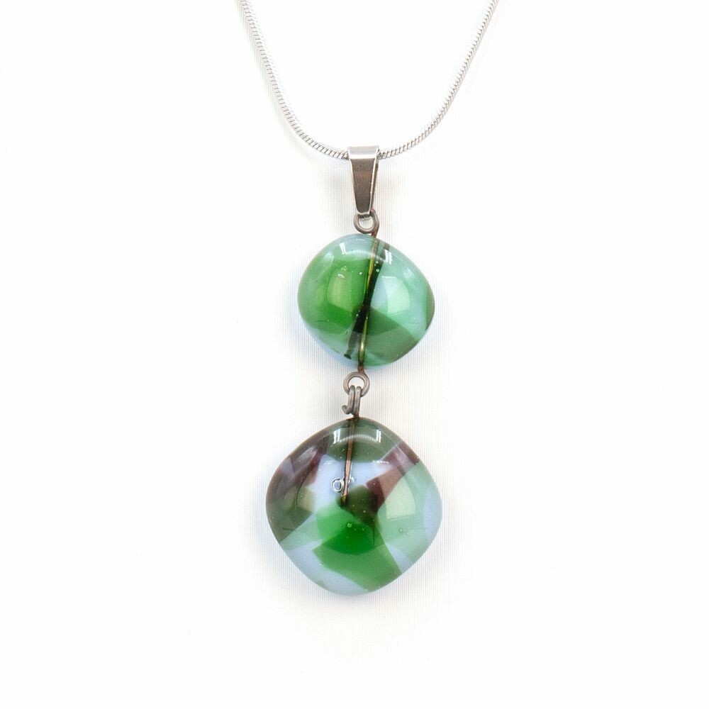 Deux perles en verre fusionné, façonnées à la main, où se mêlent vert tendre, bleu pâle et touches brunes pour un effet naturel et captivant. Monté sur acier inoxydable hypoallergénique, ce collier allie finesse artisanale et robustesse, sans craindre l’eau ni le temps. Un bijou lumineux et organique, idéal pour apporter une note élégante et singulière à votre tenue.