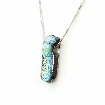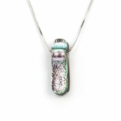 Perles en verre artisanal irisé associées à du verre dichroïque, révélant des reflets lumineux et changeants. Montées sur attaches et chaîne en acier inoxydable hypoallergénique, un matériau durable qui ne craint ni l’eau ni le temps.