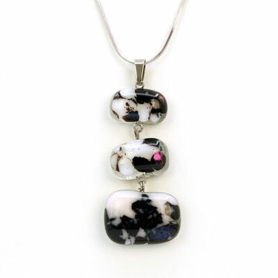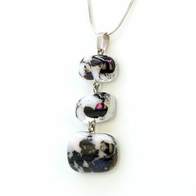 Un collier composé de trois perles en verre artisanal noir irisé, aux reflets minéraux subtils qui accrochent la lumière avec sobriété. Chaque pièce est façonnée à la main puis montée sur une chaîne en acier inoxydable hypoallergénique, un matériau durable qui ne craint ni l’eau ni le temps. Un bijou moderne, élégant et intemporel, idéal pour apporter une touche chic et mystérieuse à votre tenue.